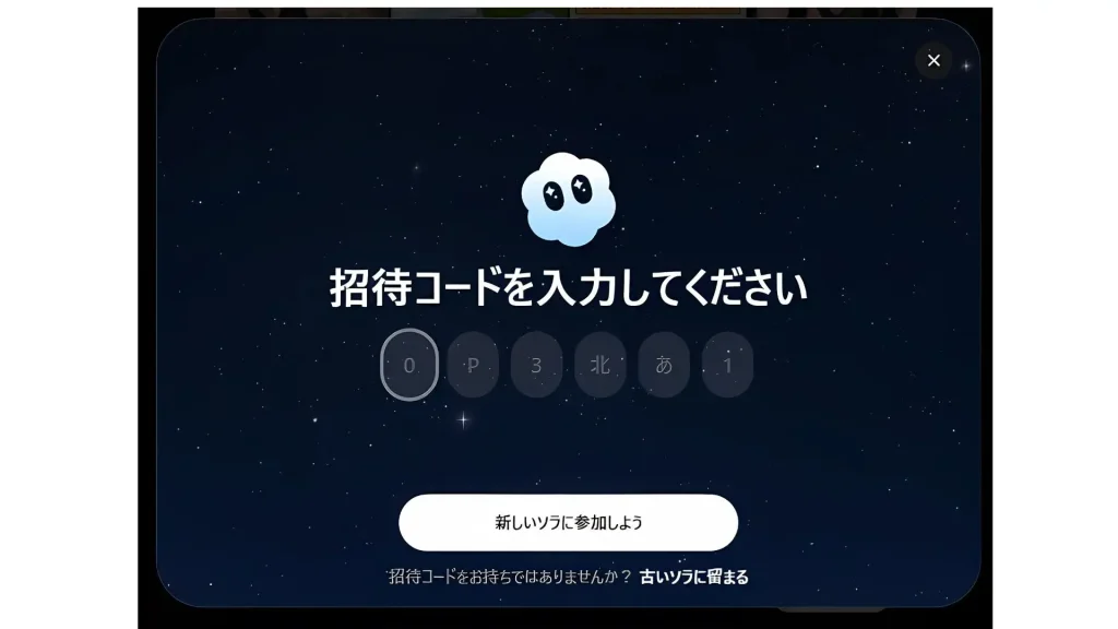 - 旧SORAに入ってしまってもOK。右下の「新しいソラに参加しよう」からいつでも招待コード入力モーダルを呼び戻せる。